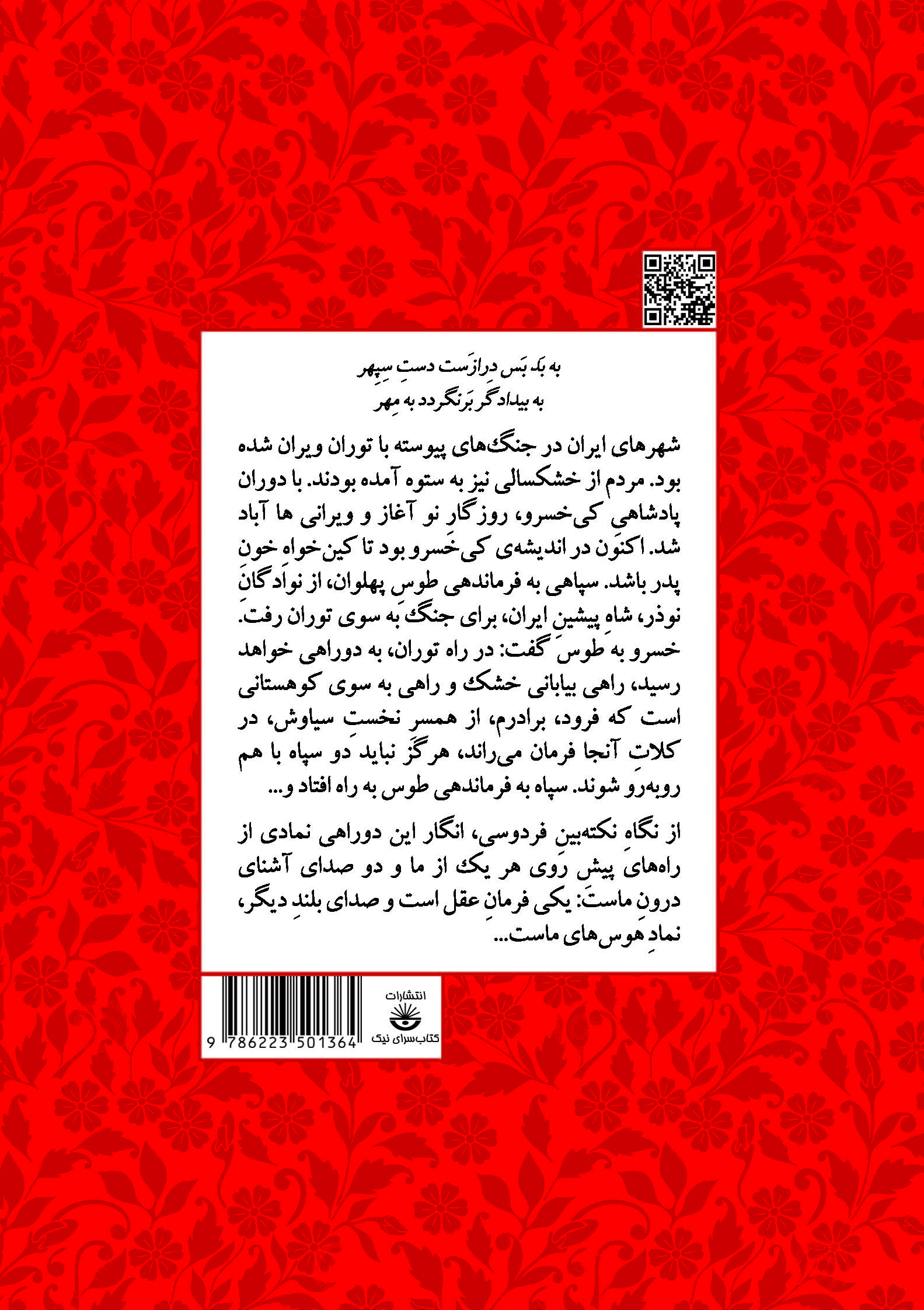 به بد بس درازست دست سپهر به بیدادگر برنگردد به مهر شهرهای ایران در جنگهای پیوسته با توران ویران شده بود. مردم از خشکسالی نیز به ستوه آمده بودند. با دوران پادشاهی کیخسرو، روزگار نو آغاز و ویرانیها آباد شد. اکنون در اندیشهی کیخسرو بود تا کینخواه خون پدر باشد. سپاهی به فرماندهی طوس پهلوان، از نوادگان نوذر، شاه پیشین ایران، برای جنگ به سوی توران رفت. خسرو به طوس گفت: در راه توران، به دوراهی خواهد رسید، راهی بیابانی خشک و راهی به سوی کوهستانی که فرود، برادرم، از همسر نخست سیاوش، در کلات آنجا فرمان میراند، هرگز نباید دو سپاه با هم روبهرو شوند. سپاه به فرماندهی طوس به راه افتاد و... از نگاه نکتهبین فردوسی، انگار این دوراهی نمادی از راههای پیش روی هر یک از ما و دو صدای آشنای درون ماست: یکی فرمان عقل است و صدای بلند دیگر، نماد هوسهای ماست...