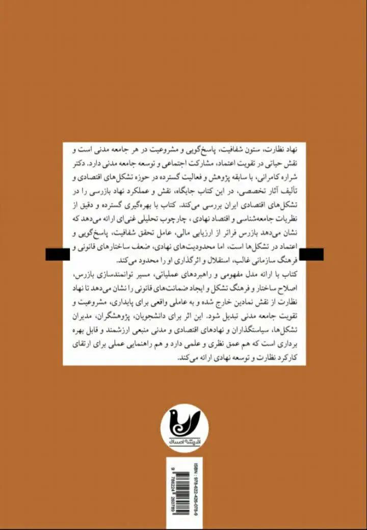 نهاد نظارت، ستون شفافیت، پاسخگویی و مشروعیت در هر جامعه مدنی است و نقش حیاتی در تقویت اعتماد، مشارکت اجتماعی و توسعه جامعه مدنی دارد.نویسنده در این کتاب جایگاه،نقش و عملکرد نهاد بازرسی را در تشکلهای اقتصادی ایران بررسی می کند. کتاب با بهرهگیری گسترده و دقیق از نظریات جامعه شناسی و اقتصاد نهادی، چارچوب تحلیلی غنیای ارائه میدهد که نشان میدهد بازرس فراتر از ارزیابی مالی،عامل تحقق شفافیت،پاسخگویی و اعتماد در تشکلها است،اما محدودیتهای نهادی، ضعف ساختارهای قانونی و فرهنگ سازمانی غالب، استقلال و اثرگذاری او را محدود میکند.