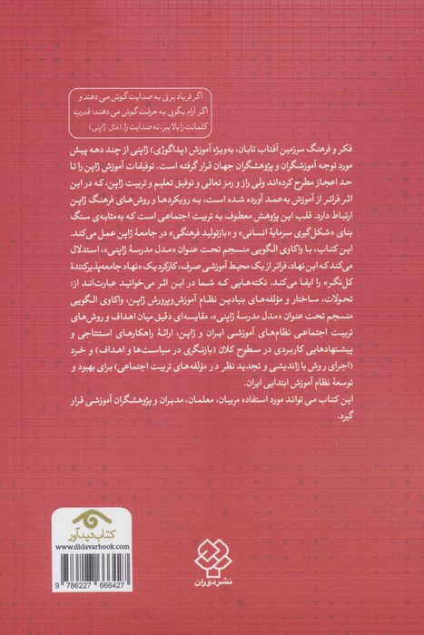فرهنگ ژاپن توجه جهانیان را به خود جلب کرده است. توسعه و پیشرفت حیرت انگیز ژاپن از حدود دهۀ هفتاد میلادی به بعد و سربرآوردن دگر باره و ققنوس وار آن از خاکستر های جنگ، موجب حیرت و حسرت مردم جهان شده و همچنین پیشرفتهای نظام آموزشی این کشور، توجه بسیاری از محققان، معلمان، مدیران و مربیان تربیتی را جلب کرده است. مسلما نقاط قوت سیستم آموزشی ژاپن را نمی توان منکر شد، اما ما هنگامی می توانیم به یک درک نسبتا جامع و صحیحی از این سیستم برسیم که آن را در کنار سایر سیستمهای آموزشی دنیا قرار داده و مقایسه کنیم.کتابی که در دست دارید نیز این رویکرد را در پیش گرفته است و سعی دارد از طریق مقایسه نظام آموزشی این کشور با نظام آموزشی آمریکا، خواننده را با زوایای جدیدی از قابلیتهای تعلیم و تربیت ژاپن آشنا کند.