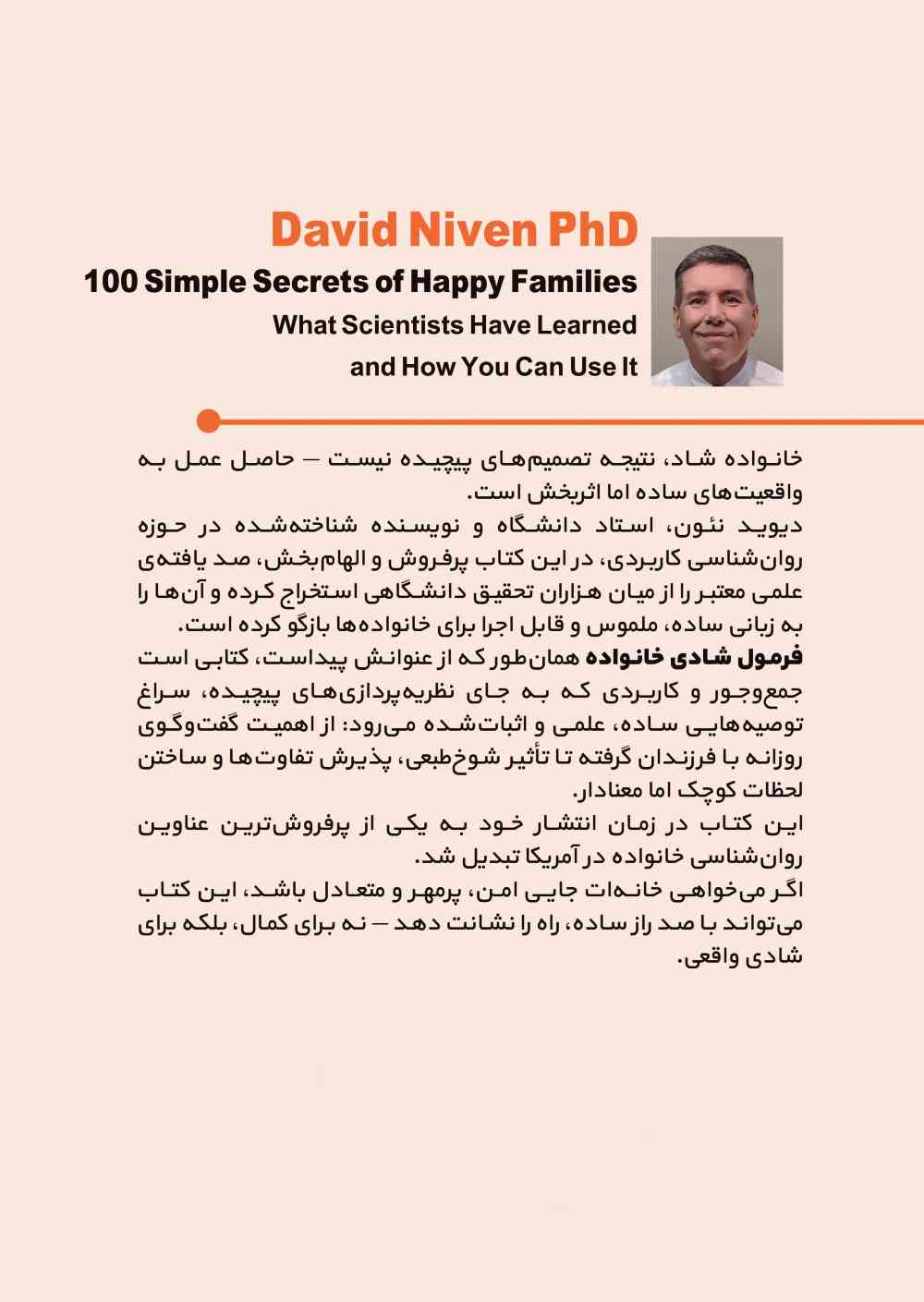 نویسنده ی کتاب پیش رو جهت ساخت خانواده ای شاد و رضایتمند و حفاظت از این بنیان ارزشمند، به بیان 100 راز مهم و کاربردی در بخش های گوناگون زندگی و مناسب برای اعضای مختلف خانواده، به صورت علمی، همراه با مثال های کارآمد می پردازد.