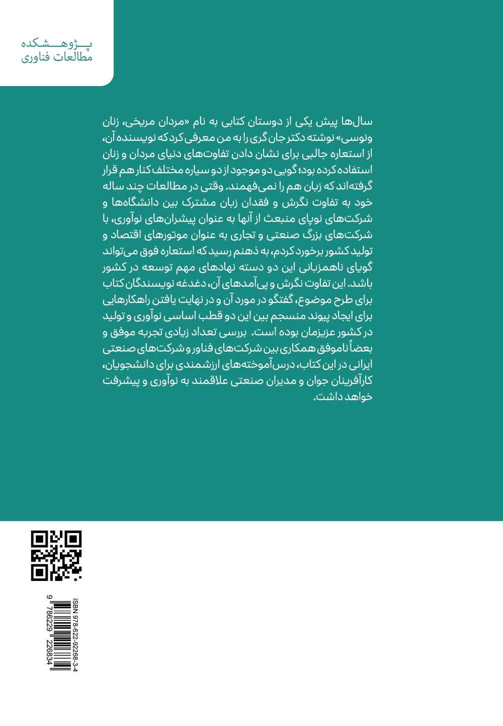 سالها پیش یکی از دوستان کتابی به نام «مردان مریخی، زنان ونوسی» نوشته دکتر جان گری را به من معرفی کرد که نویسنده آن، از استعاره جالبی برای نشان دادن تفاوتهای دنیای مردان و زنان استفاده کرده بود؛ گویی دو موجود از دو سیاره مختلف کنار هم قرار گرفتهاند که زبان هم را نمیفهمند. وقتی در مطالعات چند ساله خود به تفاوت نگرش و فقدان زبان مشترک بین دانشگاهها و شرکتهای نوپای منبعث از آنها به عنوان پیشرانهای نوآوری، با شرکتهای بزرگ صنعتی و تجاری به عنوان موتورهای اقتصاد و تولید کشور برخورد کردم، به ذهنم رسید که استعاره فوق میتواند گویای ناهمزبانی این دو دسته نهادهای مهم توسعه در کشور باشد. این تفاوت نگرش و پیآمدهای آن، دغدغه نویسندگان کتاب برای طرح موضوع، گفتگو در مورد آن و در نهایت یافتن راهکارهایی برای ایجاد پیوند منسجم بین این دو قطب اساسی نوآوری و تولید در کشور عزیزمان بوده است. بررسی تعداد زیادی تجربه موفق و بعضا ناموفق همکاری بین شرکتهای فناور و شرکتهای صنعتی ایرانی در این کتاب، درسآموختههای ارزشمندی برای دانشجویان، کارآفرینان جوان و مدیران صنعتی علاقمند به نوآوری و پیشرفت خواهد داشت.