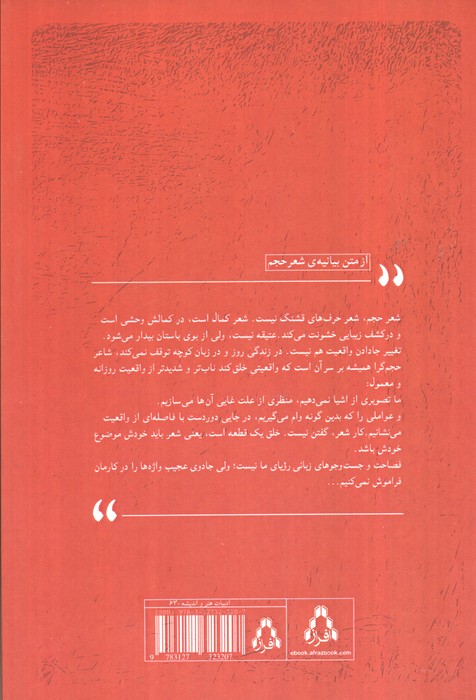 ...شعر حجم شعر حرف های قشنگ نیست.شعر کمال است در کمالش وحشی است و در کشف زیبایی خشونت میکند. عتیقه نیست ولی از بوی بایتان بیدار میشود تغییر جا دادن واقعیت هم نیست.در زندگی روز و در زبان کوچه توقف نمیکند شاعر حجم گرا همیشه بر سر آن است که واقعیتی خلق کند ناب تر و شدید تر از واقعیت روزانه و معمول: ما تصویری از اشیا نمی دهیم منظری از علت غایی آن ها می سازیم و عواملی را که بدین گونه وام میگیریم در جایی دور دست با فاصله ای از واقعیت میناشیم.کار شعر گفتن نیست خلق یک قطعه است یعنی شعر باید خودش موضوع خودش باشد. فصاخت و جست و جو های زمانی رویای ما نیست ولی جادوی عجیب واژه ها را در کارمان فراموش نمیکنیم...