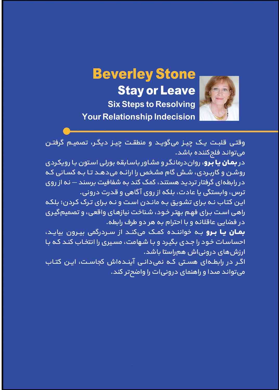 عجیب نیست که میلیون ها نفر در سرتاسر جهان در رابطه ای حضور دارند که از آن رضایت ندارند. روابط انسانی به خودی خود پیچیده است و روابط انسانی معطوف به عشق و ازدواج، بسیار پیچیده تر. درواقع همه ی روابط انسانی به دلیل نمود بیرونی شان قابلیت ارزیابی شدن دارند ولی روابط عاشقانه و زندگی مشترک، به دلیل اینکه به شدت خصوصی ست و اکثر جوانبش فقط و فقط به دو شخصی که باهم در رابطه هستند مربوط می شود و برای خودشان قابل رویت، ارزیابی و تصمیم گیری ست، همیشه آدم ها درنهایت خودشان هستند که می توانند حدود و ثغور رضایت خاطرشان را تعیین کنند و درباره ی ماندن یا رفتن تصمیم بگیرند. «بورلی استون» در کتاب «بمانم یا بروم: چگونه قاطعانه تصمیم بگیرم و زندگی ام را به باد ندهم» به ابعاد مختلف وضعیت هایی می پردازد که موجب می شود آدم ها نتوانند برای ماندن در یک رابطه یا پایان دادن به آن تصمیم درستی را بگیرند. زن ها و مردهای بسیاری بخش بزرگی از رضایت خاطرشان در روابط عاشقانه یا زندگی مشترک شان را فدای چیزهایی می کنند که درنهایت اهمیت چندانی ندارند ولی آنها توان روبرو شدن با این مسئله و اتخاذ تصمیم درست را ندارند. کتاب «بمانم یا بروم: چگونه قاطعانه تصمیم بگیرم و زندگی ام را به باد ندهم» به همه ی آن وضعیت هایی می پردازد که در زندگی عاطفی و مشترک مان با آن ها روبرو شده و با چالش در انتخاب هایمان دست و پنجه نرم می کنیم. «بورلی استون» در کتاب بسیار تحسین شده اش به کنکاش جامعی در ریزودرشت همه ی ابعاد روابط زوج ها پرداخته و درعین شرح همه ی آن چیزهایی که می بینیم و می دانیم ولی هیچ گاه به درستی درباره ی آن فکر نکرده ایم، مسیرهای بسیاری را پیش روی مان می گذارد که به واسطه ی آنها می توانیم تصمیم های درست تری برای دست یافتن به آرامش بگیریم.