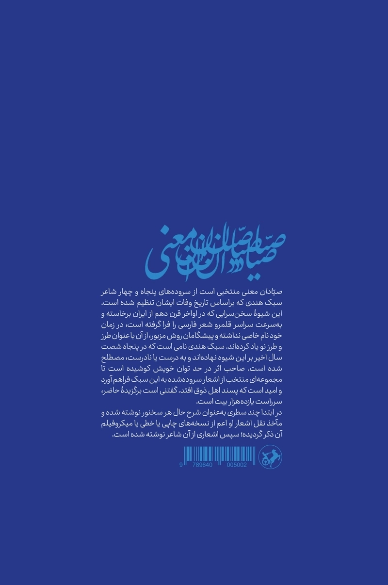 صیادان معنی منتخبی است از سروده های 54 شاعر سبک هندی که بر اساس تاریخ وفات ایشان تنظیم شده است. در ابتدا چند سطری به عنوان شرح حال هر سخنور نوشته شده و ماخذ نقل اشعار او اعم از نسخه های چاپی یا خطی و یا میکروفیلم آن ذکر گردیده؛ سپس اشعاری از آن شاعر نوشته شده است.
