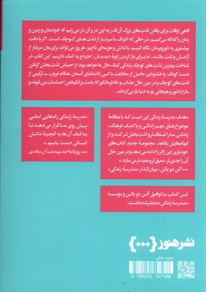 گاهی اوقات برای یافتن لذت های بزرگ آنقدر به این در و آن در میزنیم که خودمان و زمین و زمان را کلافه می کنیم، در حالی که اطراف ما سرشار از لذت های کوچک است، اگر با دقت بیشتری به دوربرمان نگاه کنیم، با تلاش و هزینه‌ای ناچیز، هر روز می تواند برایمان سرشار از آرامش و لذت باشد. اما برای باز کردن زاویه‌ی دیدمان احتیاج به کمک داریم. این کتاب در شناخت بهترین لذت های کوچک زندگی کمک حال نا خواهد بود. از احساس لذت بخش گرفتن دست کودک یا خشنودی حاصل از مخالفت با کسی تا تماشای آسمان در هنگام غروب ترکیبی از لذت های کوچک و در عین حال جذاب و خاطره انگیز که باعث برانگیختن احساسات می شوند و ما را باشور هیجانی نو به دنیا باز می‌گردانند.