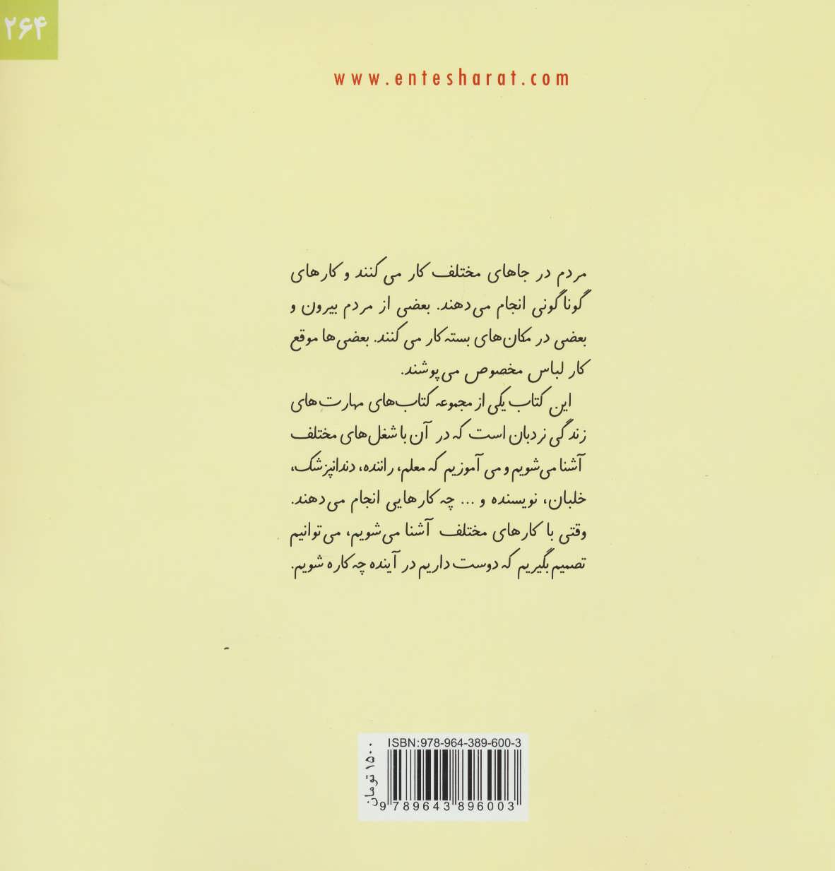 مردم در جاهای مختلف کار می کنند و کارهای گوناگونی انجام می دهند . بعضی از مردم بیرون و بعضی در مکان های بسته کار میکنند . بعضیها موقع کار لباس مخصوص میپوشند . این کتاب یکی از مجموعه کتاب های کودکان و مهارتهای زندگی است که در آن با شغلهای مختلف آشنا میشویم و میآموزیم که معلم ، راننده ، دندانپزشک ، خلبان ، نویسنده و . . . چه کارهایی انجام میدهند . وقتی با کارهای مختلف آشنا میشویم ، میتوانیم تصمیم بگیریم که دوست داریم در آینده چه کاره شویم .