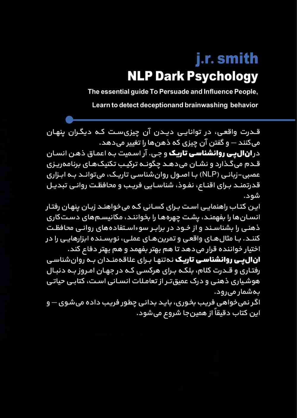 کتاب «کتاب ان.ال.پی روان شناسی تاریک: تکنیکهای برنامهریزی عصبی-کلامی» نوشتهی جی.آر. اسمیت، یک منبع جامع و عمیق در مورد کاربرد تکنیکهای برنامهریزی عصبی-کلامی (NLP) در روانشناسی تاریک است. این کتاب به خوانندگان آموزش میدهد چگونه از تکنیکهای برنامهریزی عصبی-کلامی برای تأثیرگذاری، اقناع و کنترل دیگران استفاده کنند. در ابتدای کتاب، اسمیت مفهوم روانشناسی تاریک و برنامهریزی عصبی-کلامی را توضیح میدهد. او تأکید میکند که این تکنیکها باید با احتیاط و مسئولیتپذیری به کار گرفته شوند و هدف از آموزش آنها، افزایش آگاهی و توانمندسازی خوانندگان در برابر تأثیرات منفی این تکنیکهاست. پس از این مقدمه، اسمیت به توضیح تکنیکهای مختلف برنامهریزی عصبی-کلامی مانند الگوشکنی، چارچوببندی، دستکاری احساسات و استفاده از زبان بدن میپردازد. او با ارائه مثالهای واقعی و تمرینات عملی، به خوانندگان کمک میکند تا این تکنیکها را به طور عمیق درک کنند و بتوانند آنها را در موقعیتهای مختلف به کار گیرند. یکی از نکات قابل توجه در این کتاب، تمرکز آن بر تشخیص و مقابله با تکنیکهای روانشناسی تاریک است. اسمیت به خوانندگان میآموزد چگونه نشانههای دروغ، رفتارهای پنهان و تکنیکهای اقناع را تشخیص دهند و در برابر آنها واکنش مناسب نشان دهند. این بخش از کتاب به خوانندگان کمک میکند تا از آسیبپذیریهای احتمالی در برابر تأثیرات منفی روانشناسی تاریک محافظت شوند. علاوه بر این، اسمیت در این کتاب به جنبههای اخلاقی و قانونی استفاده از تکنیکهای روانشناسی تاریک نیز میپردازد. او تأکید میکند که این تکنیکها باید با احترام به حریم خصوصی و آزادی انتخاب دیگران به کار گرفته شوند و از سوء استفاده از آنها برای اهداف غیرقانونی یا زیانآور پرهیز شود. یکی دیگر از نکات قابل توجه این کتاب، لحن انسانی و درگیرکنندهی اسمیت است. او با استفاده از زبانی ساده، روان و جذاب، مفاهیم پیچیده را به گونهای قابل درک توضیح میدهد و خوانندگان را به تأمل و کاربرد عملی آموختهها ترغیب میکند. در مجموع، کتاب «کتاب ان.ال.پی روان شناسی تاریک: تکنیکهای برنامهریزی عصبی-کلامی» یک منبع ارزشمند برای کسانی است که میخواهند در مورد تکنیکهای برنامهریزی عصبی-کلامی و کاربرد آنها در روانشناسی تاریک آگاهی یابند. با رویکرد جامع و عمیق خود، این کتاب میتواند به خوانندگان کمک کند تا از این تکنیکها برای اهداف مثبت و سازنده استفاده کنند و در عین حال، از آسیبهای احتمالی آنها محافظت شوند.