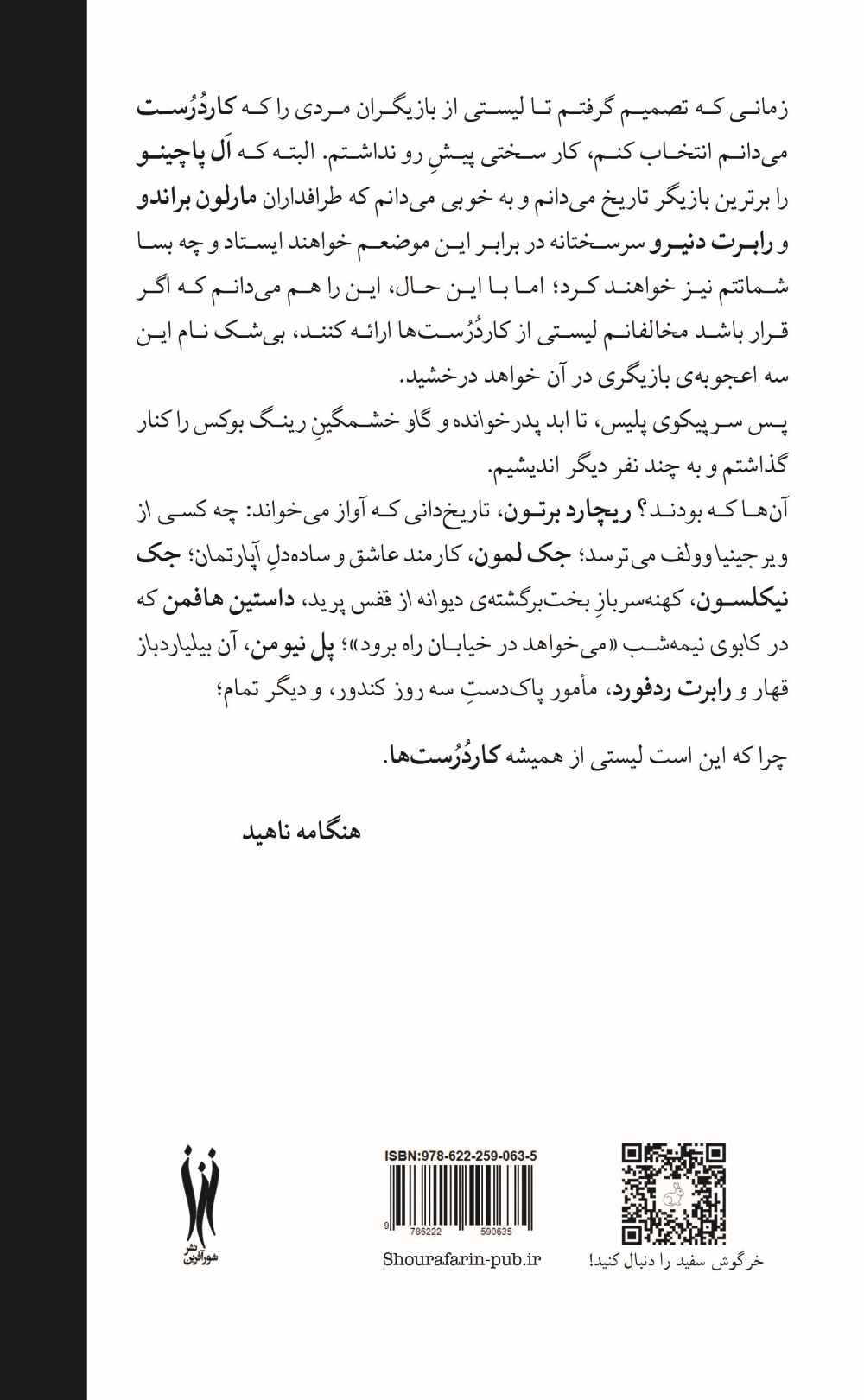 کتاب گپوگفت با کاردرستها با ترجمهی هنگامه ناهید در نشر شورآفرین منتشر شده است.در این کتاب با نه بازیگر کاردرست سینمای جهان به گفتوگو نشستهایم: ریچارد برتون، جک لمون، جک نیکلسون، داستین هافمن، مارلون براندو، آل پاچینو، رابرت دنیرو، پل نیومن، رابرت ردفورد. انتخاب این کاردرستها بر اساس تاثیرگذاریشان بر صنعت سینما و مخاطبان آن بوده و شامل دید عمیق آنها به حرفه و زندگی و پیرامونشان است و جدا از جذابیت کلی کتاب و خاطرهبازی با فیلمها و برانگیختن حس نوستالژی در فیلمبازان، میتواند برای هر هنرجو یا علاقهمند به بازیگری، چون مسترکلاسی درجهی یک، عمل کند.