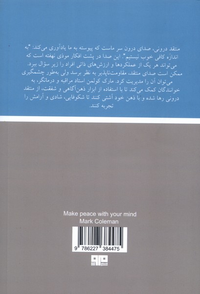 «منتقد درون» صدایی است که دائم به ما یادآوری میکند آنطور که باید و شاید، انسان خوبی نیستیم. با افکارش رفتارهای ما را زیر سوال میبرد و باعث میشود به ارزشمندی خود شک کنیم. شاید گریز از منتقد درون ناممکن به نظر برسد اما روشهایی برای مهار آن وجود دارد. مارک کولمن، درمانگر و مربی مراقبه، به ما کمک میکند منتقد درون را بهتر بشناسیم و با کمک فنون توجهآگاهی و شفقتورزی از سلطۀ آن رها شویم. این کتاب به پنج بخش تقسیم شده و در هر یک تمرینهایی عملی معرفی میشود تا افکار و رفتارهای آزارندۀ خود را بازبینی کنیم. در دو بخش اول با زادگاه منتقد درون و عملکرد آن آشنا میشویم. در سه بخش بعدی نیز به نکاتی مانند کنارگذاشتن پشیمانیها، افزایش عزتنفس و نحوۀ انجام مراقبۀ توجهآگاهی و مزایای آن توجه میکنیم. اکثر کتابهایی که بر توجهآگاهی متمرکزند، آن را ابزاری برای دستیابی به زندگی یا کار بهتر معرفی میکنند. اما تأکید اصلی مارک کولمن بر دستیابی به آرامش درونی و مهربانی با خود و دیگران است. در نتیجه، این کتاب بهترین گزینه برای افرادی است که به دنبال بهبود ارتباط با خود و دیگران و آرامکردن ذهن پریشانشان هستند.