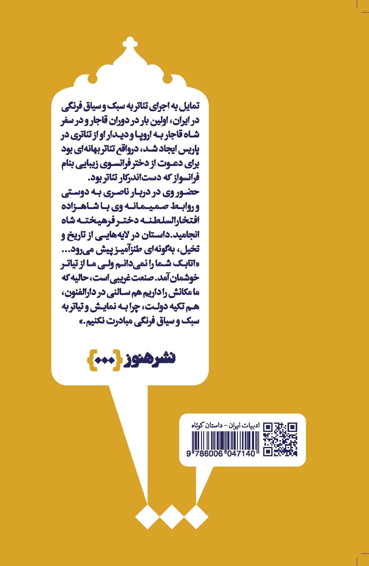 نوشتۀ حاضر حکایتی جذاب است از چگونگی شکلگیری اولین تیاتر ایرانی با استفاده از منابع و روشهای اجرای تیاتر به سبک فرنگی. آنجا که مستندات تاریخ در پرداخت این قصه ناکافی به نظر رسیده تخیل خلاق راوی پا به میان گذاشته و این روایت را شکل داده است.