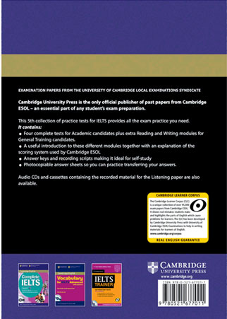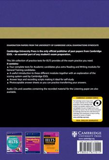مجموعه ای از نمونه آزمون های آزمایشی آیلتس است که هر ساله توسط انتشارات کمبریج منتشر می شود. این کتاب مرجع کاملی از سوالات آزمون آیلتس همراه با پاسخ های آن می باشد که شما با مطالعه آنها خود را برای شرکت در این آزمون آماده خواهید ساخت. همچنین همراه این کتاب، فایل های صوتی مرتبط با آن نیز با فرمت MP3 در اختیار زبان آموزان قرار گرفته است.